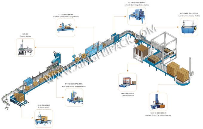 Линия упаковки в картонную тару состоит из машины для сборки коробок, машины для упаковки в коробки, машины для взвешивания картонных коробок, машины запечатывания картонных коробок, паллетайзера и палетообмотчика.