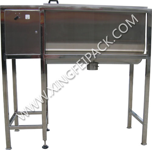 Горизонтальный смеситель ленточного типа предназначен для перешивания порошкообразных материалов, в том числе сухого молока, молотой фасоли, куриной эссенции и крахмала. Смеситель может использоваться в комплекте с загрузочным устройством. Вся машина, кроме мотора и колесного вала, изготовлена из нержавеющей стали.